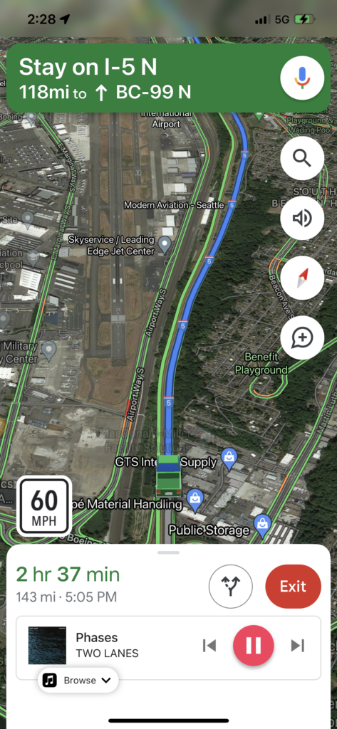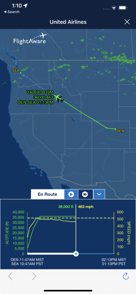 I arrived at the airport on the morning of Thursday Dec 2 with plenty of time to spare. My flight was 8:25am and I’d have a stop in Denver. I padded my trip with enough time that I was expecting to arrive in Seattle in early afternoon Pacific time (1:13pm to be exact) and then drive just a couple hours or so to the Canadian boarder, catch a ferry and at the BnB in the early evening, which should let me get settled and get a good night sleep. All seemed to be working according to plan.