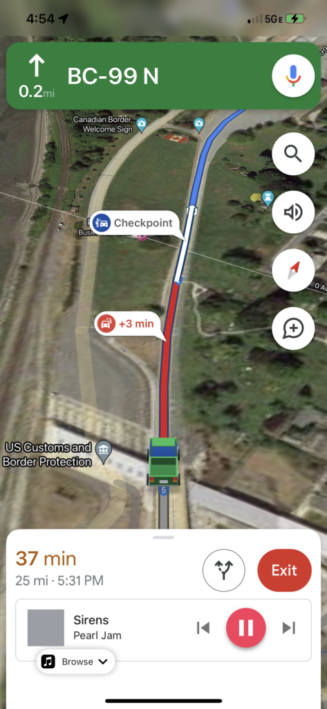 I finally arrived at the boarder and passed a sign that said “Customs and Immigration 1 Mile” at close to sundown and my GPS was showing a small delay (37 mins) which I expected. Great, I’m going to make it I thought. As I drove up over a hill I could see a line of cars stopped. So I patiently sat in traffic fully expecting to move through customs pretty quickly. I texted Guy to let him know I was at the boarder and waited. The ferry was just about 5 min across the boarder so I was still good on time. But Traffic wasn’t really moving more than a few feet and the 37min delay came and went. At this point I started to be pretty concerned that I was going to miss my ferry but I still had about 40 mins to make it.