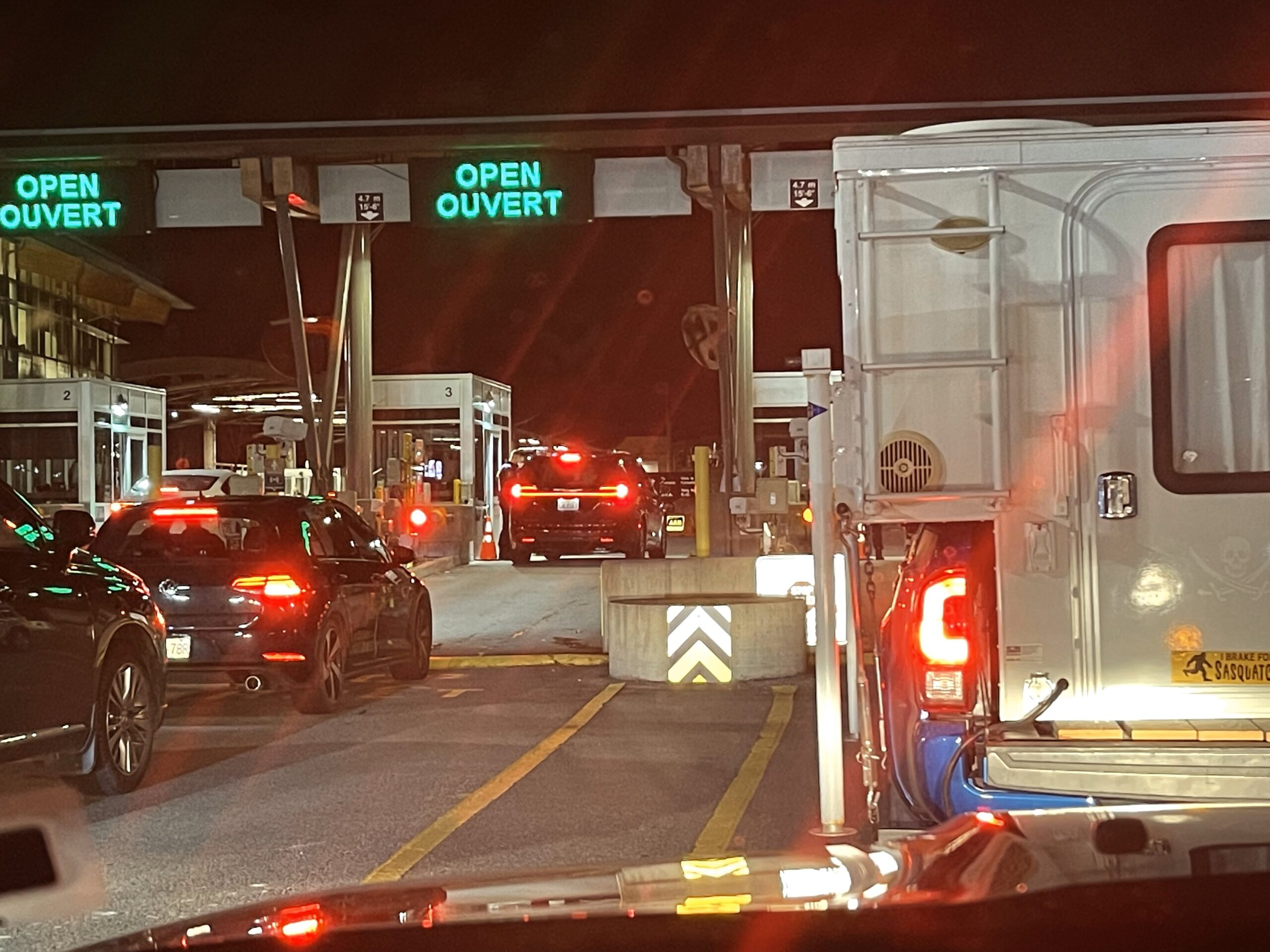 I finally arrived at the boarder and passed a sign that said “Customs and Immigration 1 Mile” at close to sundown and my GPS was showing a small delay (37 mins) which I expected. Great, I’m going to make it I thought. As I drove up over a hill I could see a line of cars stopped. So I patiently sat in traffic fully expecting to move through customs pretty quickly. I texted Guy to let him know I was at the boarder and waited. The ferry was just about 5 min across the boarder so I was still good on time. But Traffic wasn’t really moving more than a few feet and the 37min delay came and went. At this point I started to be pretty concerned that I was going to miss my ferry but I still had about 40 mins to make it.