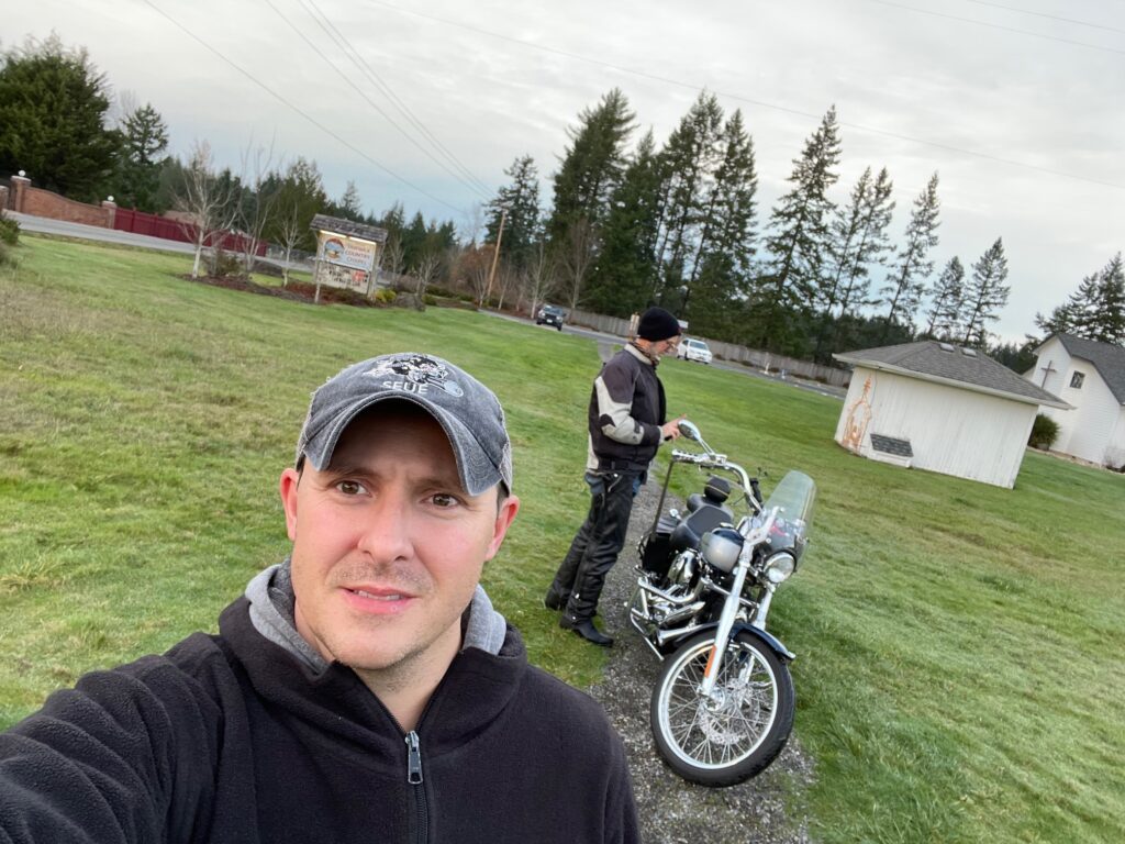 One problem as you get closer to a mountain, you actually may have harder time seeing it because of other hills and smaller mountains blocking the way. Eventually after about an hour of driving, it was getting close to sundown, but I found a great spot to pull off and take a photo. This would definitely be my last opportunity and I didn’t want to be any further into the wilderness after dark with no supplies and likely no cell phone service. The pull off was a cute little chapel and park that was clearly privately owned. I was trying to take selfies of me and the mountain when a Harley rider pulled up and asked if I wanted him to take my picture. I was happy to have the help and I returned the favor by taking a few good pics of him and his bike in front of the mountain. We chatted for 10 mins or so and he told me he comes there often to just think. I agreed it was a great spot.