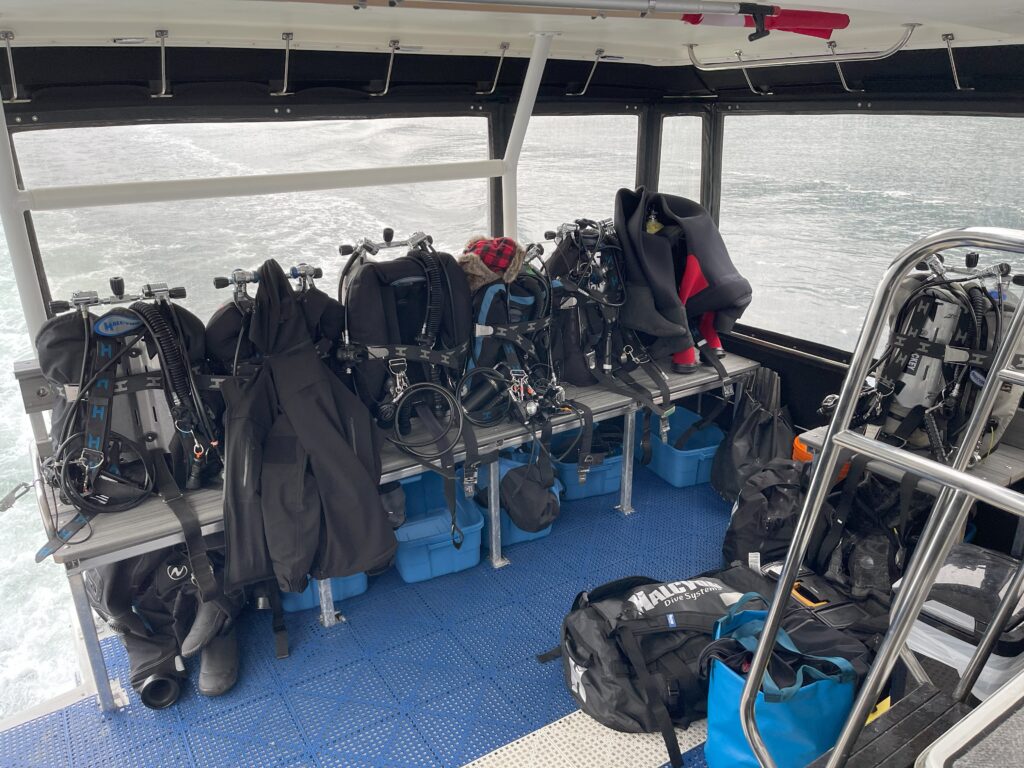 I arrived at the marina and found several others waiting in the parking lot already. After some introductions, we hauled gear over to my old friend The Thermocline and loaded everything onto the top deck or into the salon. I felt a little bit like a local by now. The weather was drastically different compared to the last time I was on this boat but she’s got a super comfortable heated salon incase the weather turned nasty.