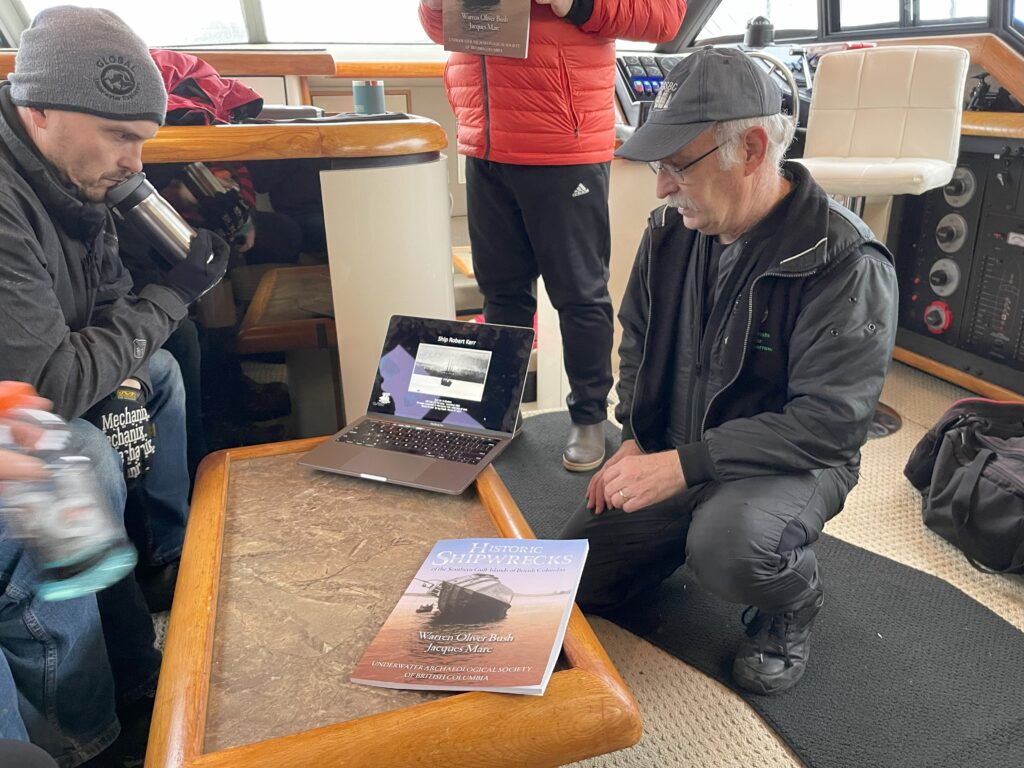 Jacques did a short presentation with all of us gathered around in the salon. He went over the dive plan and showed a brief slide show and gave us a general virtual tour with some maps and videos so we knew what to expect. We were to take measurements on the wreck of The Robert Kerr. as well as set up some project baseline stations at the bow and stern. There are several good you tube videos on this wreck to get an idea of what she looks like. At one point the Robert Kerr was a sailing ship hauling coal and other goods before eventually being converted to a barge until her ultimate resting place just off of Vancouver Island. Read all about her here: https://www.nauticapedia.ca/Gallery/Robert_Kerr_logs.php